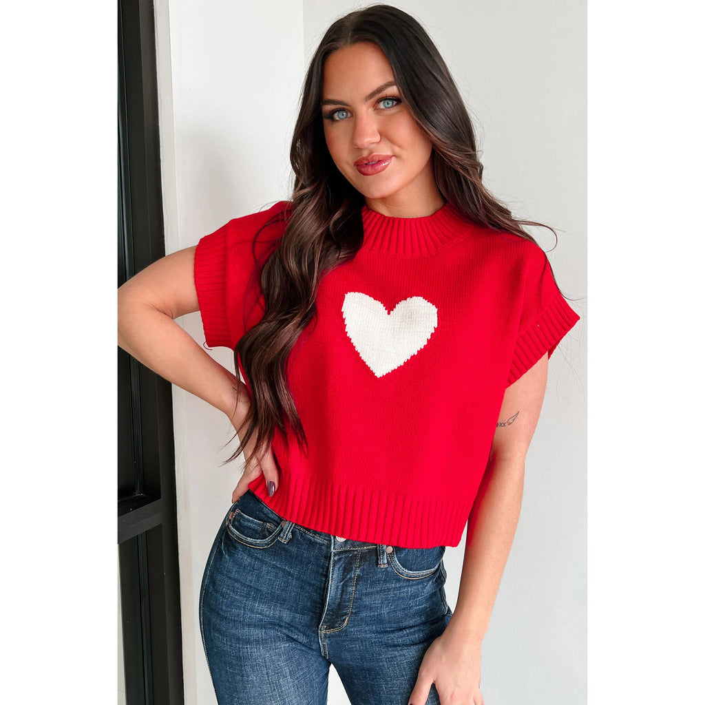 Fiery Red Valentine Heart Graphic Cropped Short Sleeve Sweater